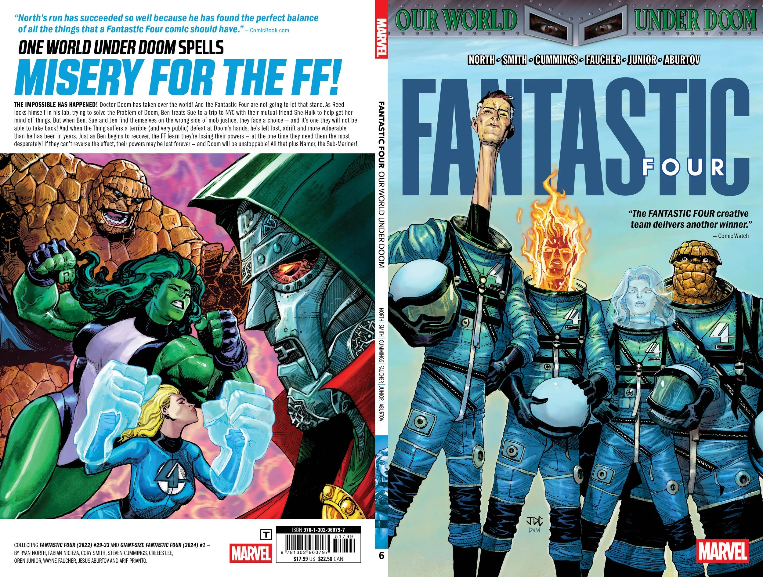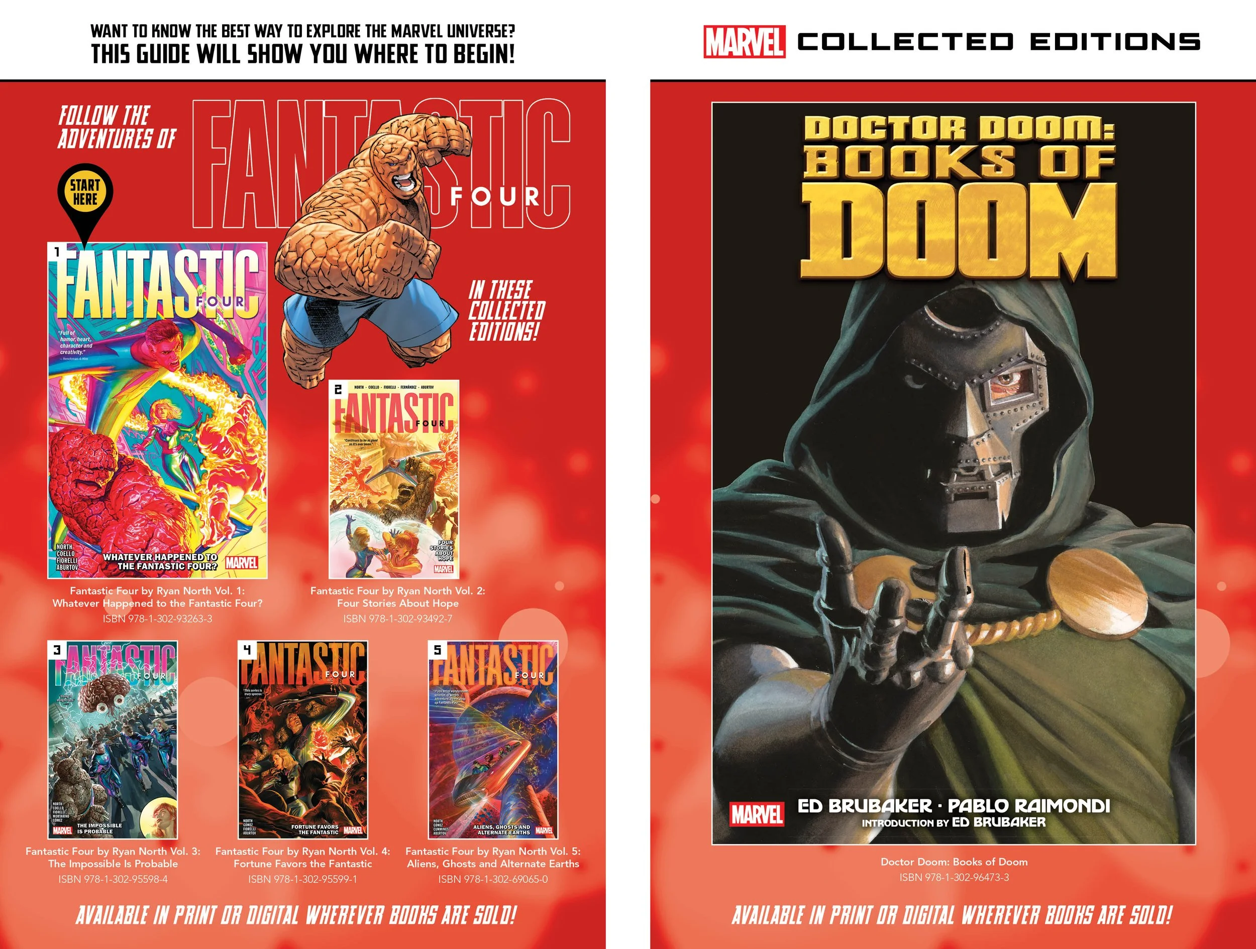 Above you have the front and back covers along with the inside cover. Typically a monthly collection has the weekly issues that come out all in one. The inside covers show which books have come out prior. They also serve as a guide to help inform new readers about the story. To the left you have the first few pages when you open the book, the half title giving a glimpse into what is in store and the credits spread.